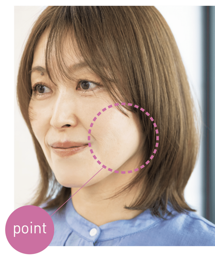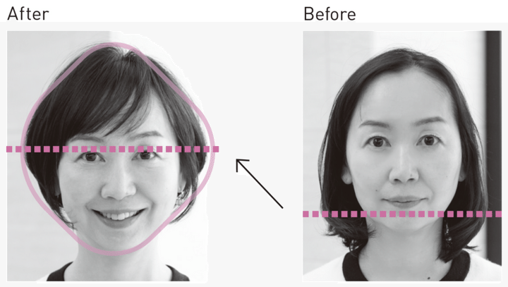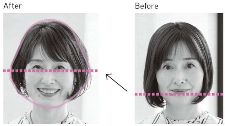 輪郭を見え隠れさせることで、丸顔をすっきり見せつつ、卵型のようなシルエットに補正。