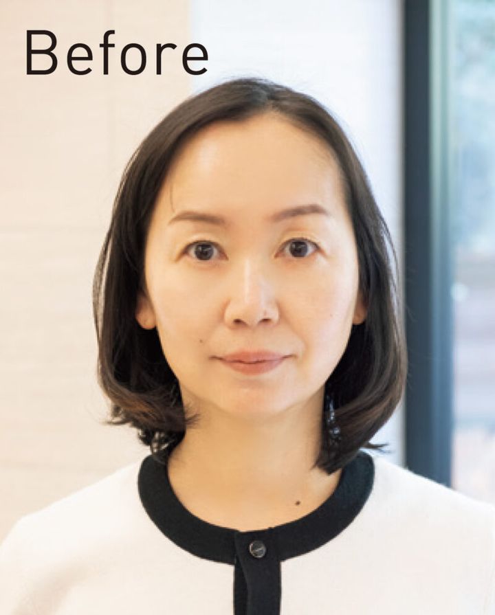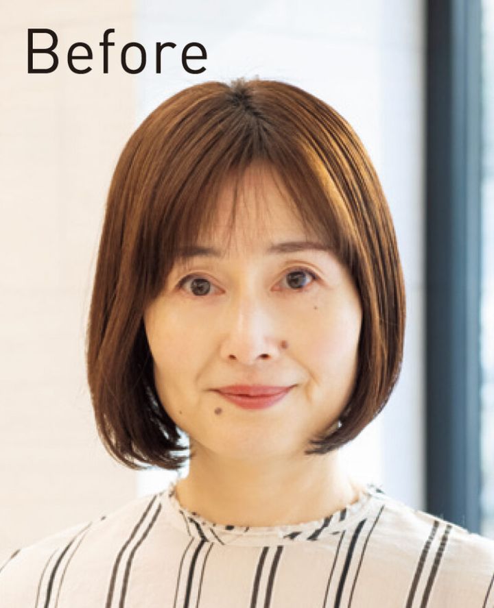 「やや薄めの前髪をほんの少し厚くして、顔まわりにつながるようにカットし、自然におろしています。額が見える面積を狭くすることで、骨格を引き締める効果も。前髪の分量を少し変えるだけでも、骨格がカバーされるので、ぜひ見直して」