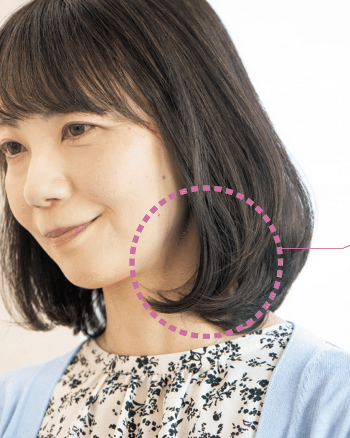 ☑︎ 気になるえら張りを目立たなくするため、あごあたりの内巻きボブで隠している。
