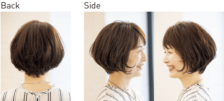 「分け目が目立たないよう、トップにふんわりとしたボリュームをつくります。さらに額を出し過ぎないように前髪をつくり、ひし形シルエットのショートボブに。目線がボリュームのあるサイドと頭頂部にいくため、小顔効果も抜群です」