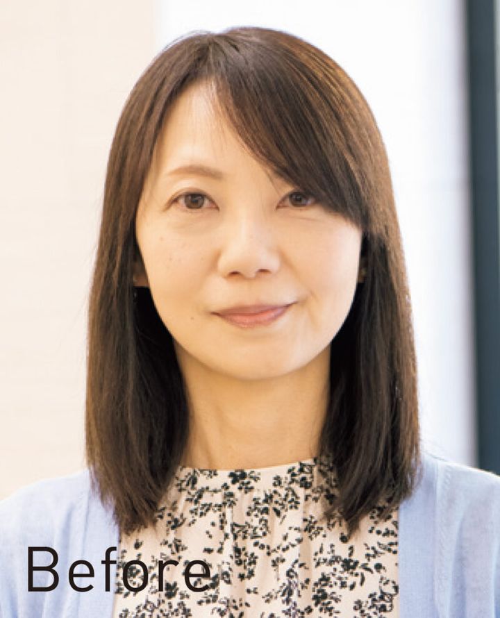 「外ハネ気味の毛先がより寂しいイメージを与えてしまっています。長さはほぼ変えずに、丸みのあるシルエットであご周辺にボリュームが出るように設定するのがコツ」(寺岡さん)。