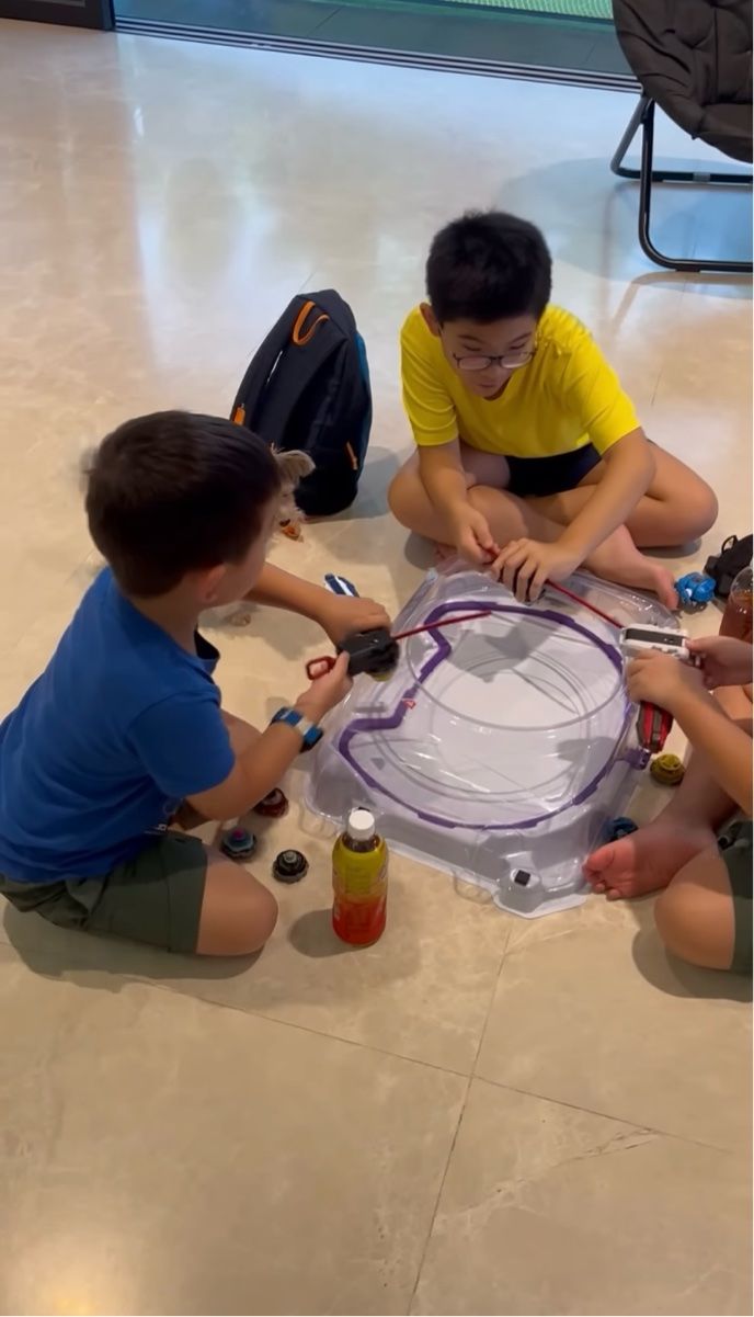 この子は、白熱したバトルの展開にテンションが上がりきっています。 高速で回転するベイブレードを追いかけるように、身を乗り出しておててをバタバタさせています。