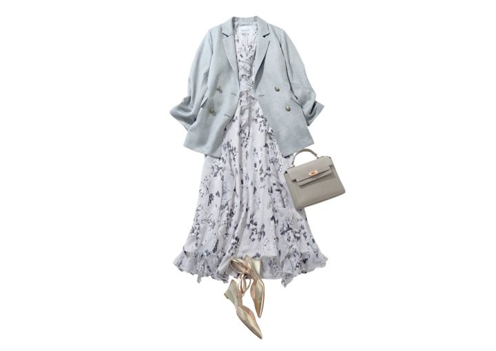 GW前の内勤は、華やかワンピースで気分を上げて。フリルがあってもやわらかな素材だから、ジャケットやカーデを重ねやすいのもいい。軽やかな薄グレーなら優しげかつ、きちんとした印象に。