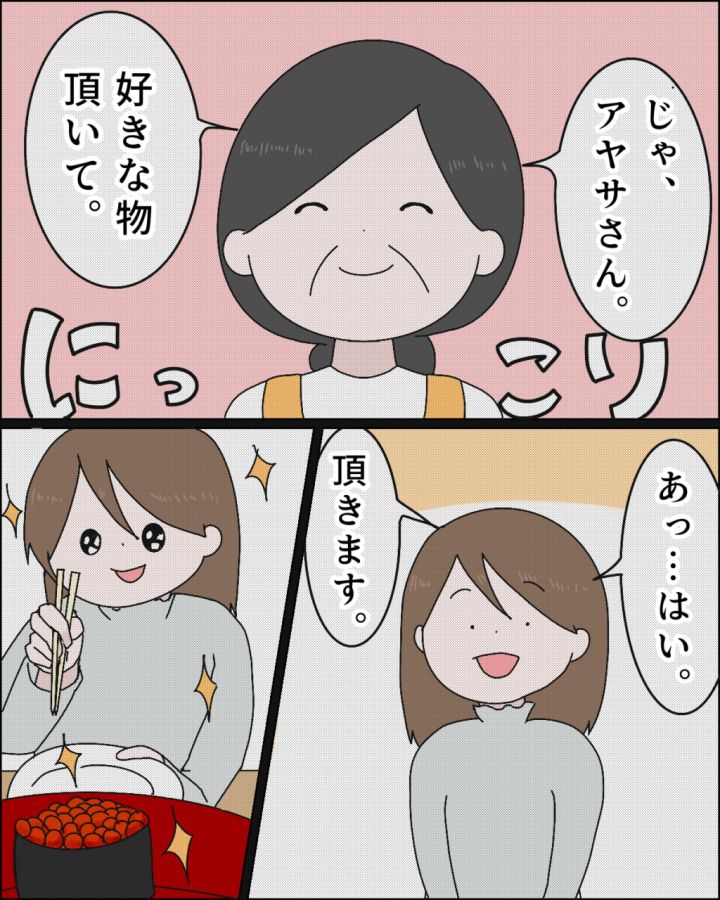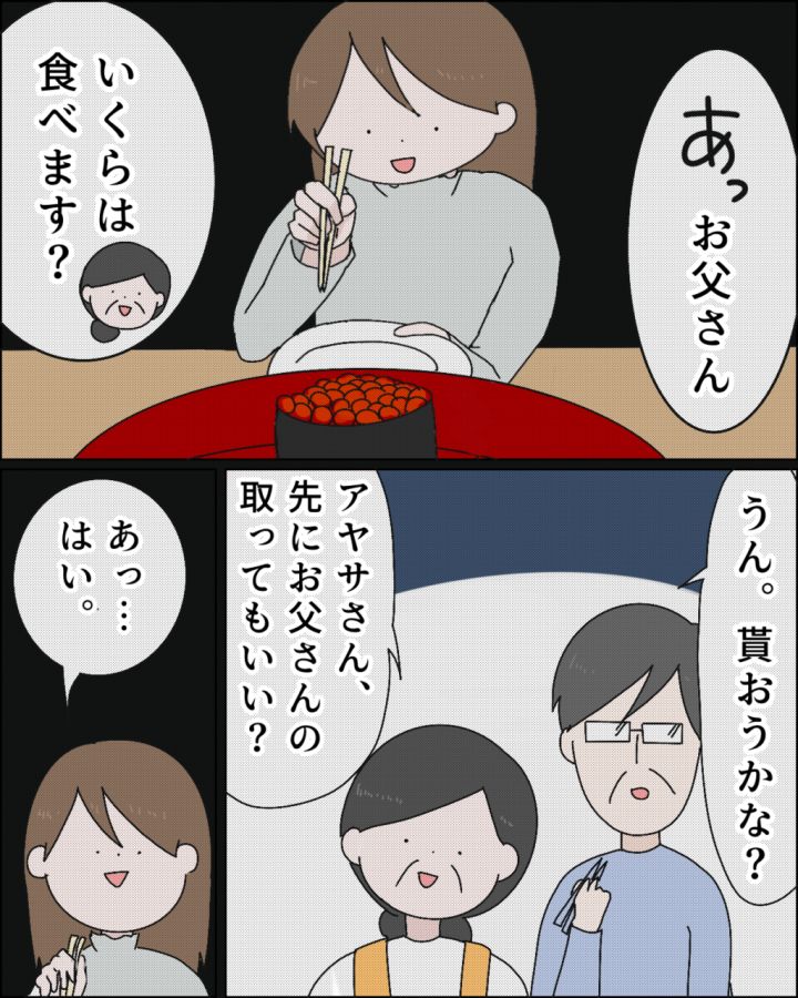 いくらに手を伸ばしかけた私を遮るかのように、義母が「あっお父さん、いくらは食べます?」と口を挟みました。義父は当然のように「うん。貰おうかな?」と言ったので「アヤサさん、先にお父さんの取ってもいい?」と言う義母にイヤと言えるはずもなく「あっ・・・はい。」ユキヒロが言いたいのは、あの時の義父のような扱いをして欲しいということなのかな。