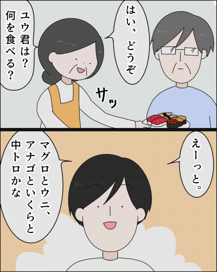 義母は「はいどうぞ」とお皿を義父の前に置くと、今度は夫のユキヒロに「ユウ君は?何を食べる?」と聞きました。同じように座って待っていた夫は「えーっと。マグロとウニ、アナゴといくらと中トロかな。」と言って義母にお皿に取ってもらいました。