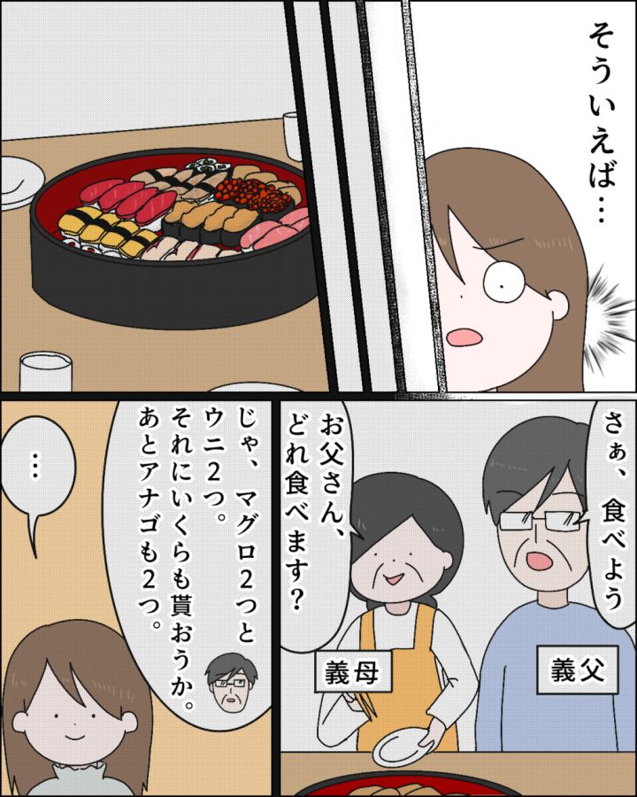 3. 義実家で寿司の出前。義父は食べたいものを好きなだけ義母に指示して取らせる。家で一番偉いオレ|ママ広場マンガ