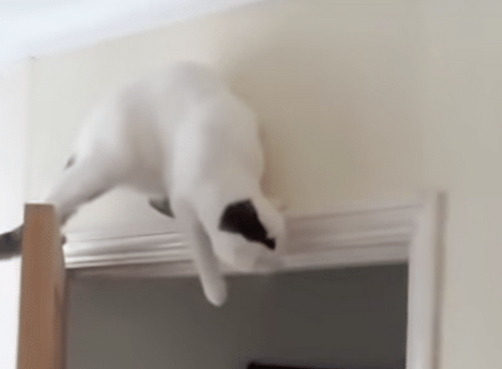 飼い主をドアの上で待ち伏せする猫。イタズラするつもりが
