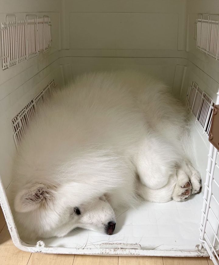 クレートの中で大きな体を丸めて寝ていたのは、サモエドの『ダッツ』くん。 おててやあんよを折りたたむようにして、コンパクトに収まろうとしているのも愛らしいですね~。