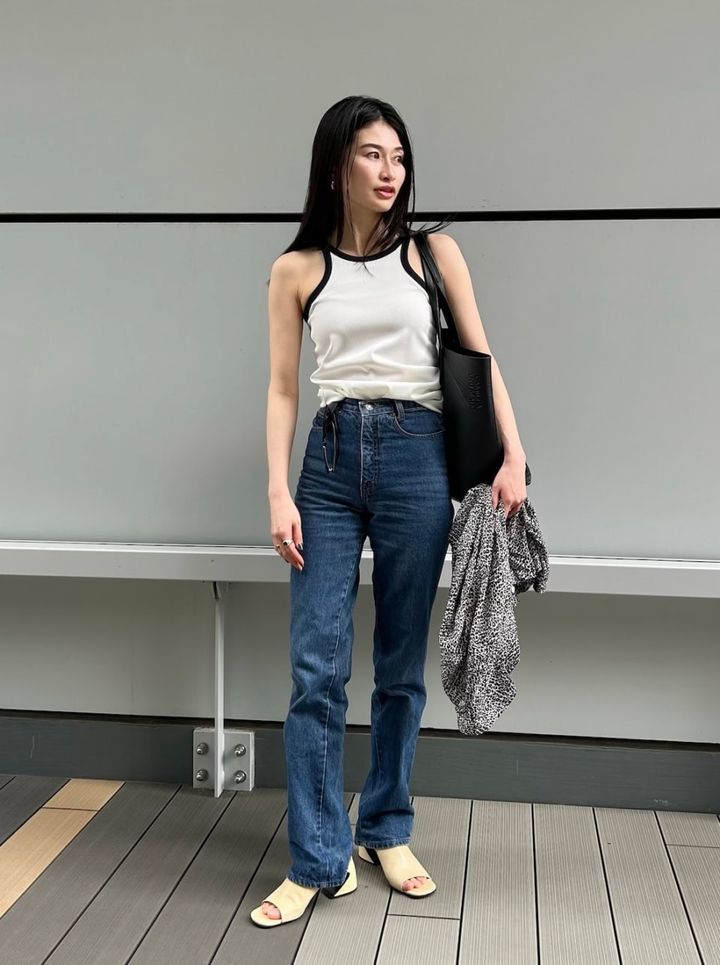 「カルバン・クラインのヴィンテージデニムにモダンなデザインのタンクトップを合わせ、これからの暑い季節の制服になりそうなデニムコーデに仕上げました。肩のラインや、お尻のキュッとしたボディラインをあえて出し、メリハリを効かせてヘルシーさを意識しています。ラフになり過ぎないよう、トップスの黒のラインに合わせ同色のミニマルなビッグトートバッグとサングラスをプラス。さらになじみのいいヒョウ柄のシャツとクリームイエローのミュールをポイントにしています」