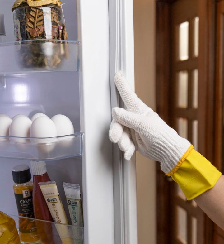 見落としがちなのが、本体と扉の接続部分。ここも中性洗剤を塗布し、すきまに指先を入れて拭きましょう。狭くて指が入らない場合は、軍手の指先をつまんで引き出し、すきまに入れて指を動かしても。庫内と同様に最後に水拭きを。
