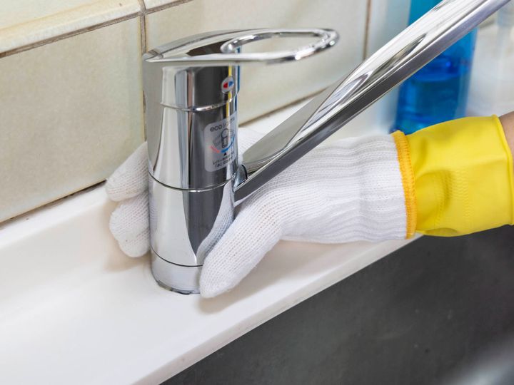 水栓の根元にこびりついた黒ずみやぬめりは、中性洗剤を塗布してこすりましょう。ぞうきんなどでは拭きにくい壁と水栓のすきまにも指が入るので、水栓を回転させるように指を動かし、360度しっかりきれいに。