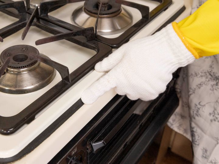 調理中の油が飛び散ったべたべた汚れは、アルカリ性洗剤を塗布して拭きましょう。ガスコンロと作業台の段差にこびりついた汚れは、指に力を入れてこすると、スルスルッと落ちます。