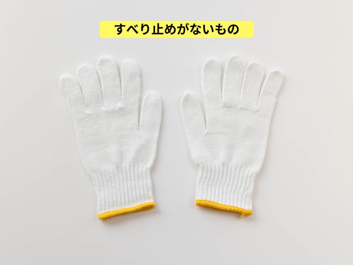 手のひらにすべり止め用のでこぼこがついていない布製の軍手なら、どんなものでもOK。ドラッグストアや100円ショップなどでは、大人用だけでなく子ども用の軍手も手に入ります。