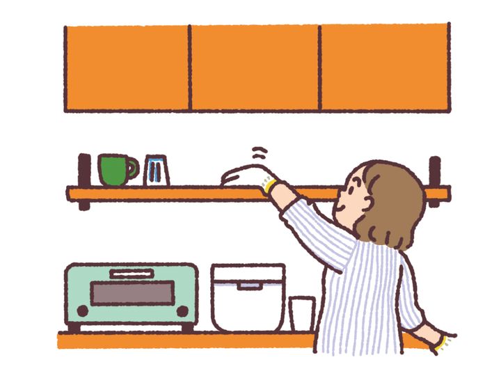 近ごろ多いオープンタイプの吊り戸棚は、視界に入りにくい上部にも油を含んだ汚れがつきやすい場所。アルカリ性洗剤を塗布して、指先でべたつきやざらつきを感じなくなるまで拭きましょう。