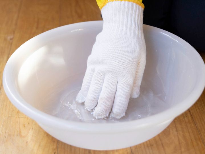 手あかや水まわりのぬめりなどは、指先だけ水でぬらした軍手でこするとすっきり。水を入れたボールや洗面器を用意しておくと、汚れてもすぐに洗えて便利。