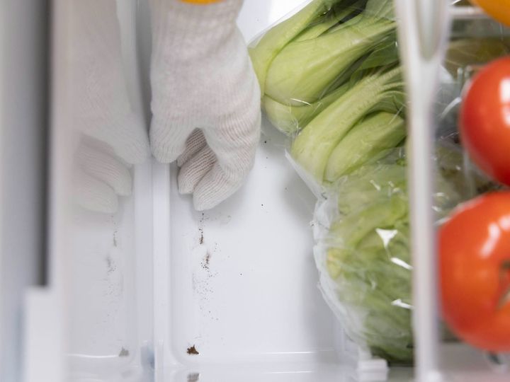 ドアパッキンの溝にいつの間にか入り込んだ汚れは、中性洗剤を使って拭きましょう。庫内の食品に洗剤がつかないよう、パッキンではなく指先に洗剤を塗布して。仕上げに水拭きをします。