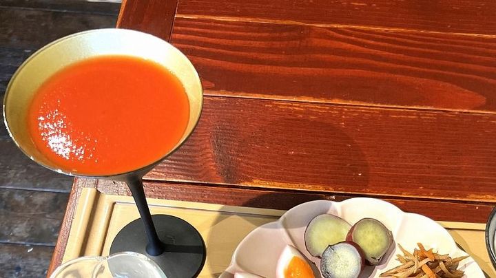 とても甘味があり、優しさと深さのある美味しいトマトジュースを、ワインを飲むかのような気分のグラスでいただけるのも、特別感があってうれしい!