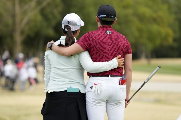 阿部未悠プロと岩井明愛プロの後ろ姿をキャッチ。2人のプロは、偶然にもウェアとカードホルダーを色リンクさせた着こなしに。ポケットからさりげなくのぞくカードホルダーが、後ろ姿にもしっかりおしゃれ感をプラス。ゴルファーならではの着こなしポイントです。