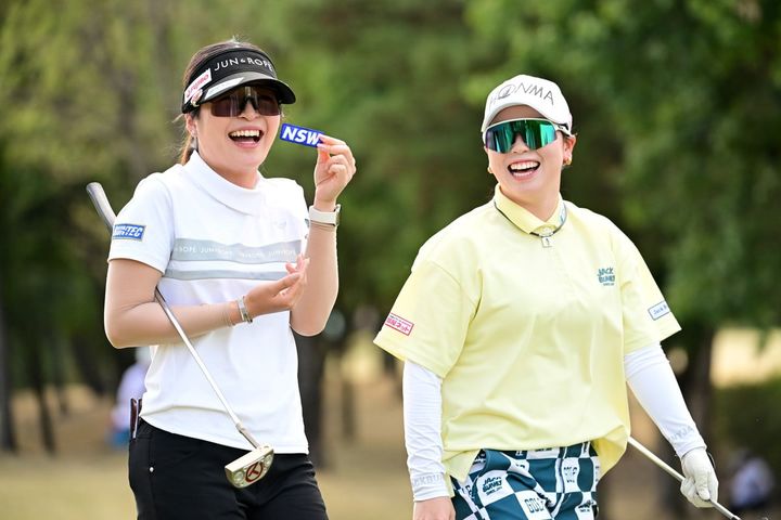 華やかなピンク色トップスに花柄スカートを同系色でまとめた河本プロ。サンバイザーのロゴやネイルまで色リンクさせた着こなしはおしゃれ上級者のなせる技と言えるでしょう。桑木プロはバイカラーのトップスにポップな幾何学柄のスカートを合わせ、全身を存在感のある華やかコーディネートに仕上げています。