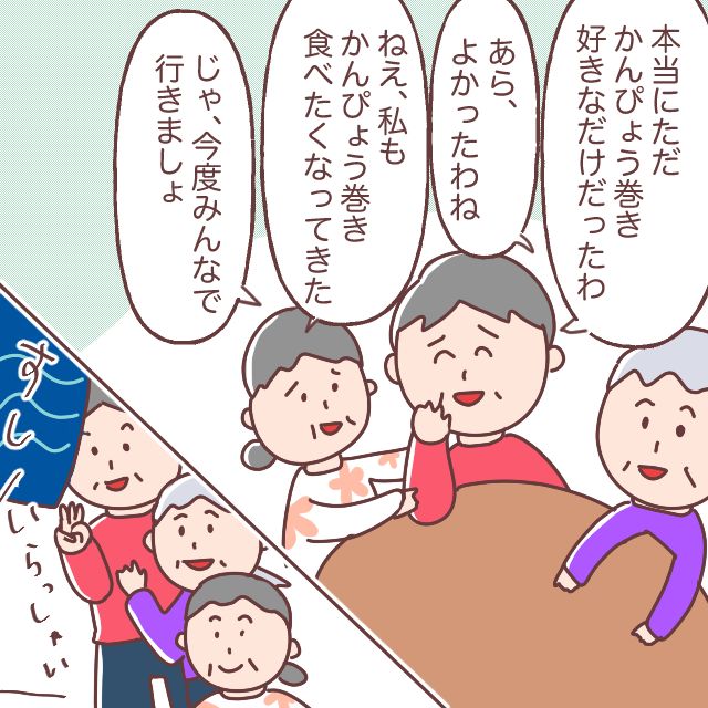 後日、友達にも「本当にかんぴょう巻きが好きなだけだった」ことを伝えると、一緒に喜んでくれました。話していたら、私も友達も、かんぴょう巻きが無性に食べたくなり、後日みんなで一緒に寿司屋に行き、カスミさんが大ハマりしたかんぴょう巻きを美味しくいただきました。