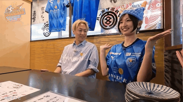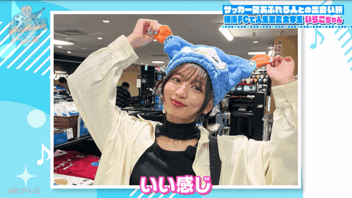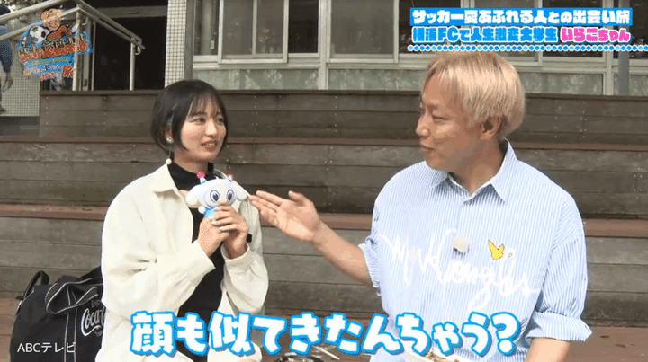 いらこちゃんは、パッチリとした大きな瞳や、ショートヘアからのぞく“ハマブルー(横浜FCの色)”のインナーカラーがチャームポイント。その愛らしい姿は、自身が横浜FCで特に大好きだという、マスコットキャラクター・フリ丸にそっくり!? そんないらこちゃんにしんいちは、「めちゃくちゃ顔がタイプ!」「シンプルに顔がかわいい!」「スタイルがいい!」「勉強もできて、顔もかわいくて、サッカー愛もある……めっちゃええやん!」とデレデレだ。