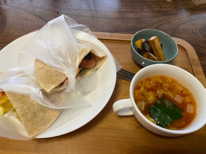 私は、野菜オムレツとソーセージの2種類を楽しめる、ピタパンセットを注文。友人は日替わりランチの豆腐ステーキをチョイス。