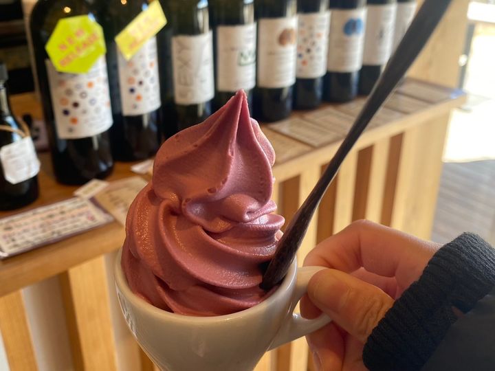 ワイナリーでは、無農薬ブドウのジェラートも食べることができます。想像していた「ブドウ味」とはちょっと違う。ブドウの爽やかな風味はありつつも、さつまいものようなほっこりとした甘みがありました。