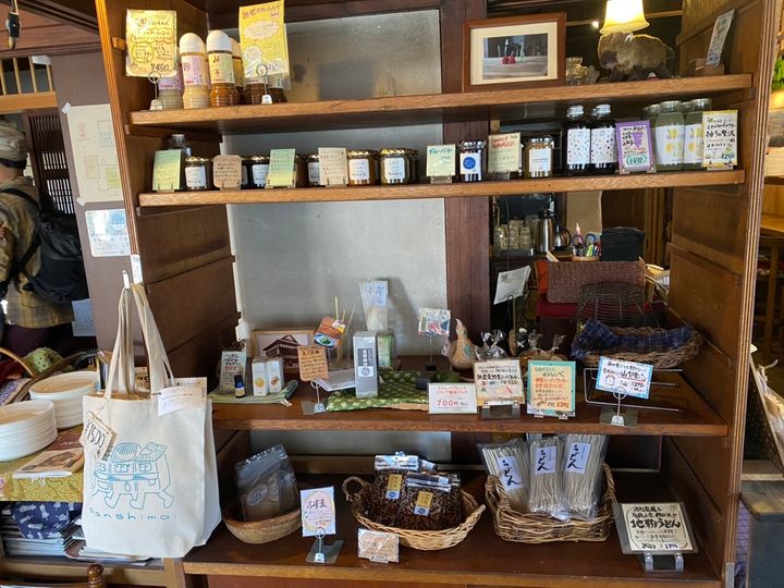 食事の後は、店内の物販コーナーをのぞいてみましょう。無農薬野菜で作られたジャムや、有機小麦のうどんなど、お土産にぴったりなアイテムがそろっています。