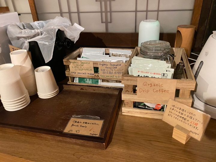 古民家でも寒くないよう、暖房設備を整えてくださっていたおかげで、熟睡できました。翌朝、ラウンジのオーガニックコーヒーを飲んでチェックアウト。mujaquiをあとにします。