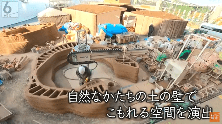 ホースの先からホイップクリームのように絞り出されるやわらかい土が、はみ出さないよう正確に塗り重ねられる…。そんな作業が進んでいたのは、大屋根リングのすぐそばで建設中のトイレ施設。峡谷の岩肌を思わせる、自然な形の土壁が印象的だ。