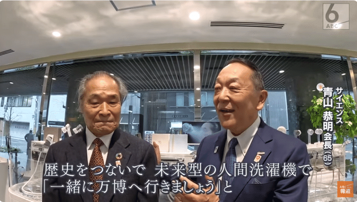 1970年の万博当時は小学生だった青山会長。今でも忘れられないほどの衝撃を受けたという人間洗濯機の開発者からのコンタクトに胸が躍ったとか。完成したミライ人間洗濯機に「大満足」と目を細める山谷さん。55年越しに実現した夢は、また未来の誰かを動かすかもしれない。