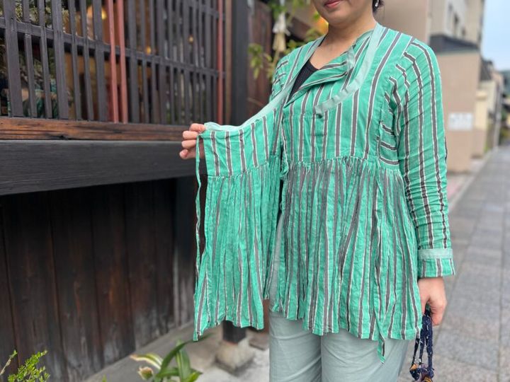 インド北西部の遊牧民の民族衣装から着想した「さゆうま」オリジナルのラバリジャケット。グリーンベースにグレーのレジメンタルストライプの生地は肌触りが良く、自然で独特なシボ感が涼しげ。「1枚で着るととても気持ちいいのですが、前を全開にして羽織としても着られるよう、少しゆとりをもたせた設計になっています」。