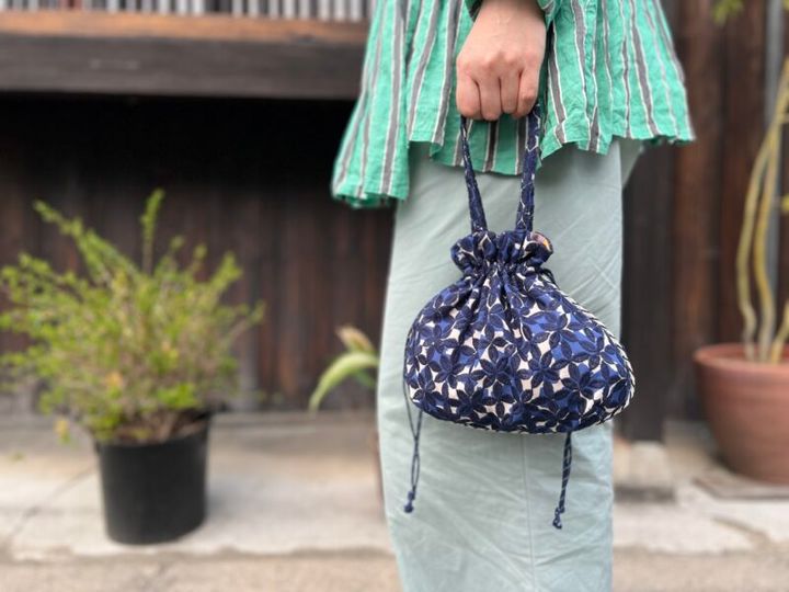 中国のお土産から着想を得たという「さゆうま」新作の巾着バッグ。「着物を着ることも多いので、最近は、着物にも合わせられる小物探しが趣味になっています」。