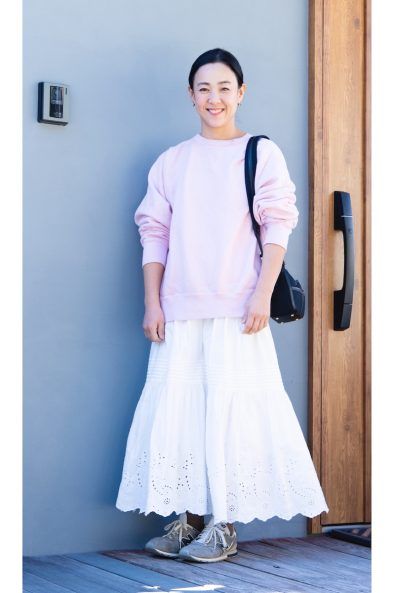 カジュアルなスウェットに、レーススカートで甘さを添えた、宇藤さんの春らしい着こなし。