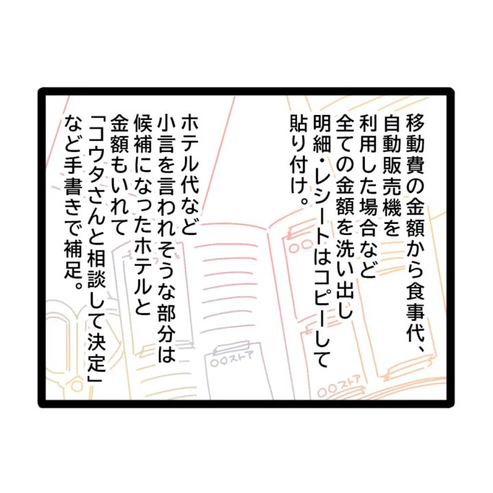遊園地旅行はアヤカさんのクレジットカードで払って後から折半することにしていたため、義母に明細を出すように言われていました。そこでアヤカさんは義母への提出用の資料を作っていました。移動費の金額から食事代、自動販売機を利用した場合など、全ての金額を洗い出し、明細やレシートはコピーしてノートに貼り付け。ホテル代など小言を言われそうな部分は候補になったホテルと金額も入れて「コウタさんと相談して決定」など手書きで補足。できる限りのものを準備したのです。