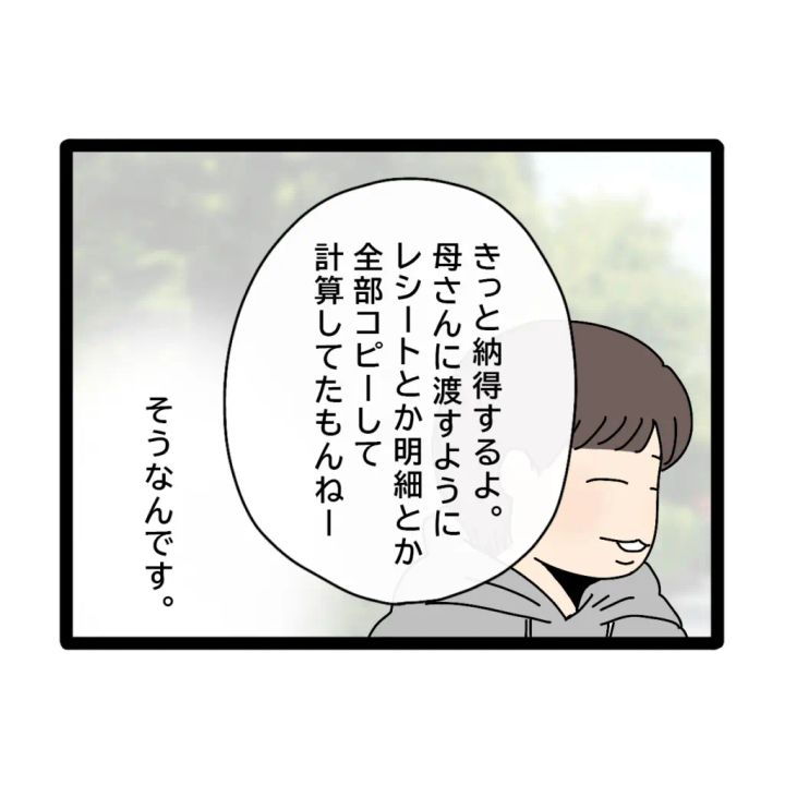 義母がアヤカさんのことを金遣いが荒くてコウタさんをそそのかしていると誤解していることも、アヤカさんが義母のお金管理から自分たちへと変えたいことも知らないコウタさんは、「きっと納得するよ。母さんに渡すようにレシートとか明細とか全部コピーして計算してたもんねー」と、どこまでものん気です。