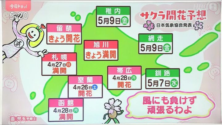 桜前線はいま、道北から十勝地方のあたりです。サクラちゃんは風に負けず頑張っています。きょう2日(金)留萌で開花、旭川では満開になりました。室蘭や帯広もそろそろ満開になって、連休後半は見ごろになりそうです。