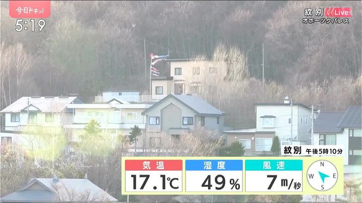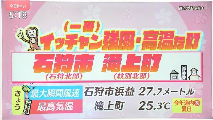 南風が強まり、石狩市の浜益では最大瞬間風速27.7メートル、歩けなくなるほどの突風が吹きました。その強い南風が暖かい空気となって山を吹き下りるフェーン現象の影響で、オホーツク海側では気温が上がり、滝上町では25.3度と道内今年初の25度以上の夏日になりました。おととい4月30日(水)は雪が積もったのに、今日は夏の暑さでした。体がついていきませんね。体調崩さないようにしてください。