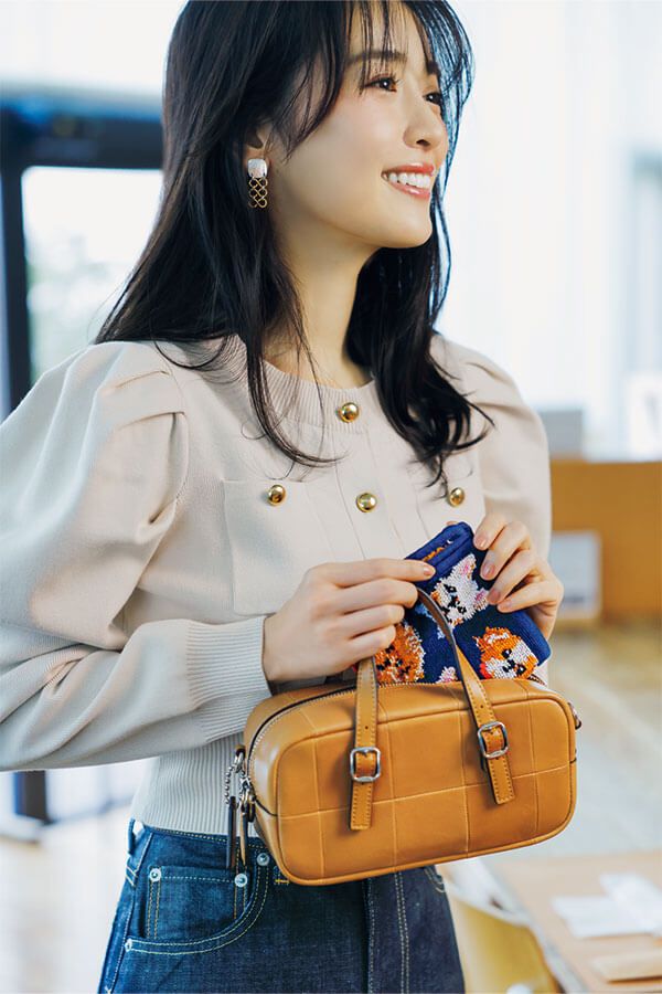タオルハンカチ¥2,750/ラブラリー バイ フェイラー(フェイラー) カーディガン¥10,890/WILLSELECTION(WILLSELECTION ルミネエスト新宿店) パンツ¥22,000/woadblue(ヤマツゥ) イヤリング¥9,900/マージョリー・ベア(ココシュニック 新宿タカシマヤ店) バッグ¥55,000/コーチ(コーチ・カスタマーサービス・ジャパン)