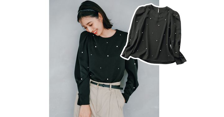 3. パール付き『とろみブラウス』は1枚でキレイめキープ!