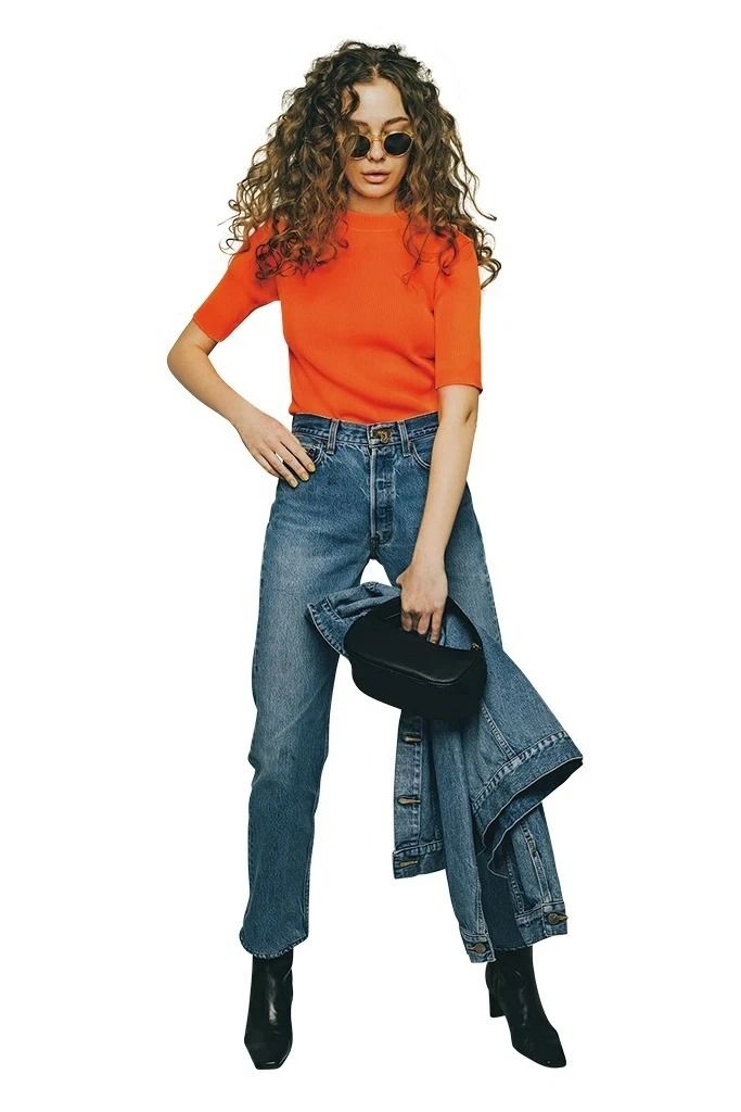 ナイトアウトにもぴったりなオレンジ。伸縮性のある上質なリブによるコンパクトなシルエットも相まってブルーデニムを甘く、カッコよく。派手な色こそ「INできるコンパクト」でひかえめにとり入れるのがコツ。ニット素材ならではの上品な発色もメリット。
