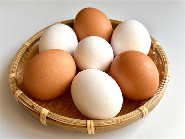 卵の殻の色は、基本的には「鶏の種類」によって決まります。一般的に羽毛が褐色や黒っぽい鶏は「赤玉」を産み、羽の白い鶏は「白玉」を産む傾向があります。赤玉の卵を産む鶏は、白色の鶏に比べ産卵量がやや低いため、価格がやや割高になります。また、殻の色によって卵の栄養価に違いはありません。