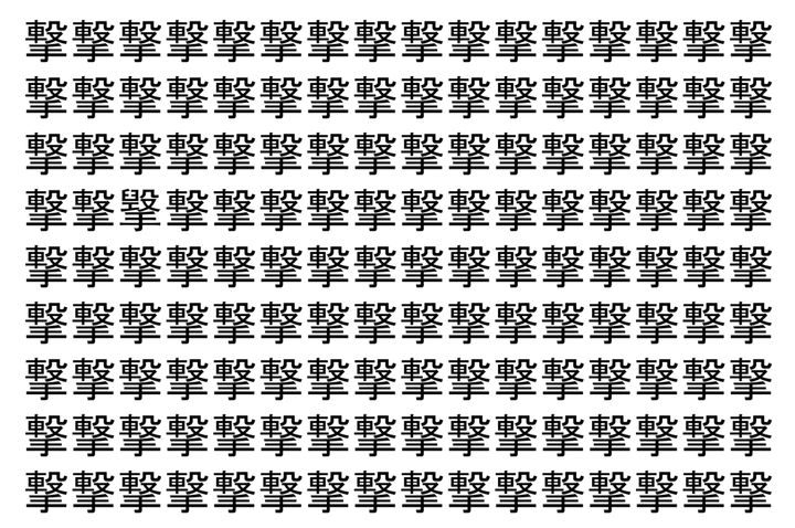 画像の中には、「撃」という漢字が縦に9行、横に16個並んでいます。 全部で144個となりますが・・・、そのうち1つは「異なる漢字」となってますよ!!