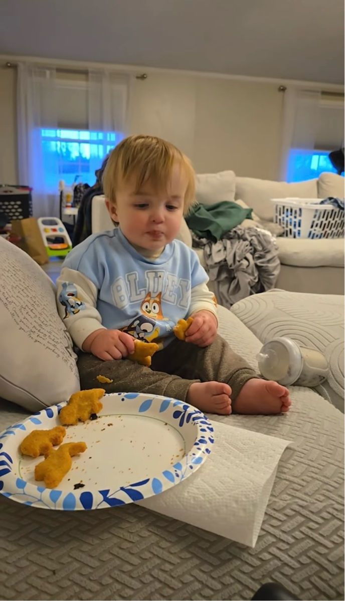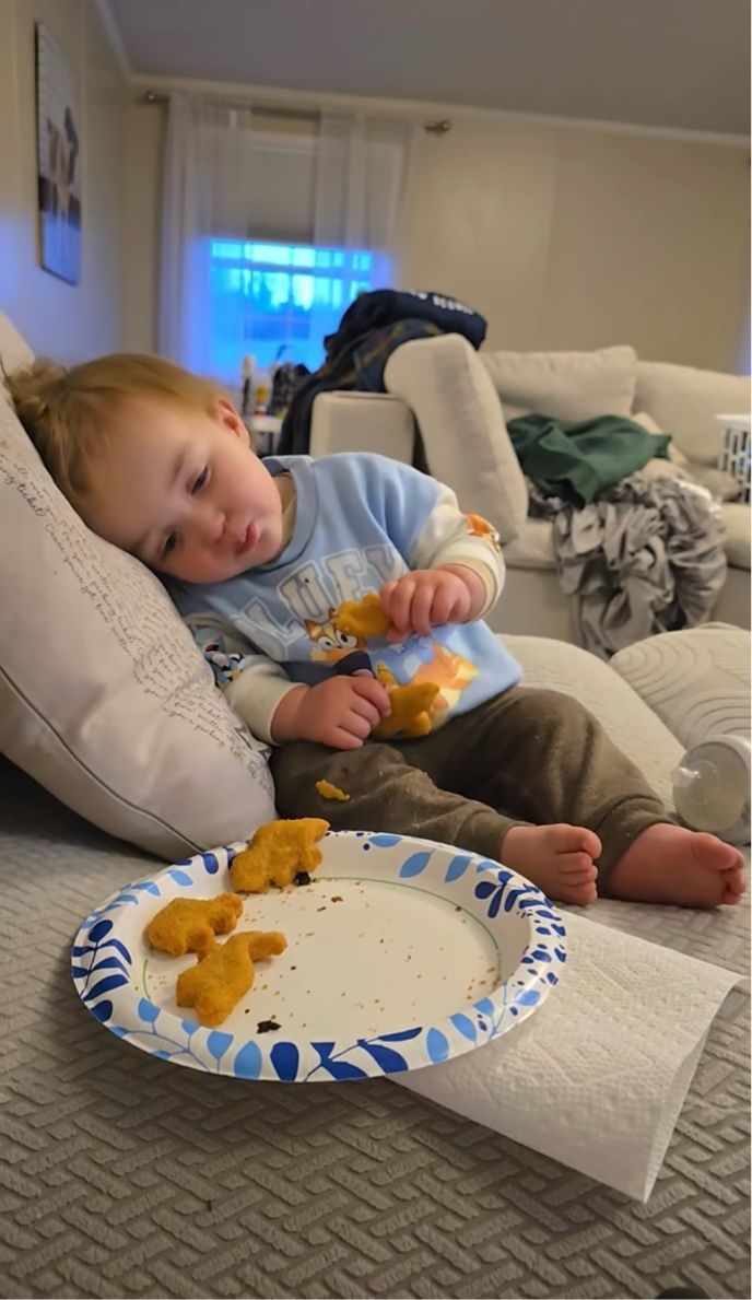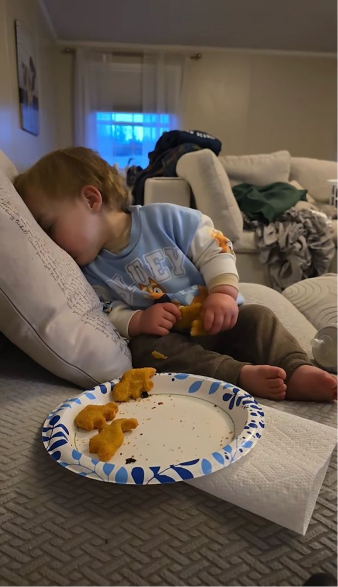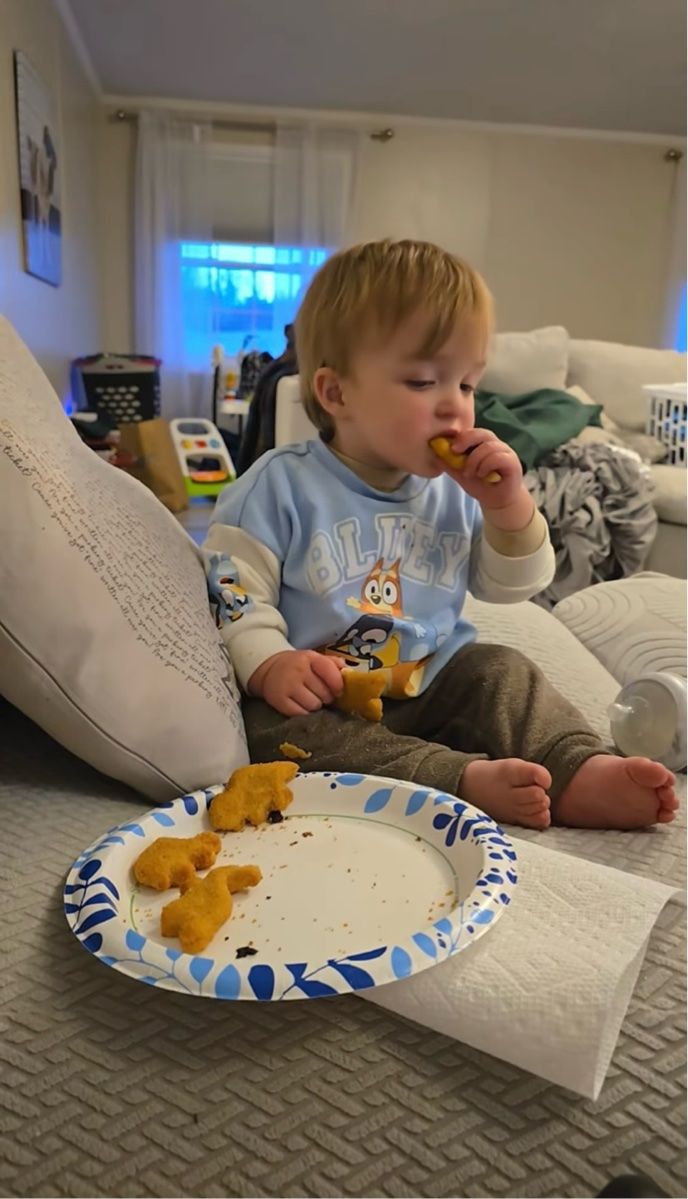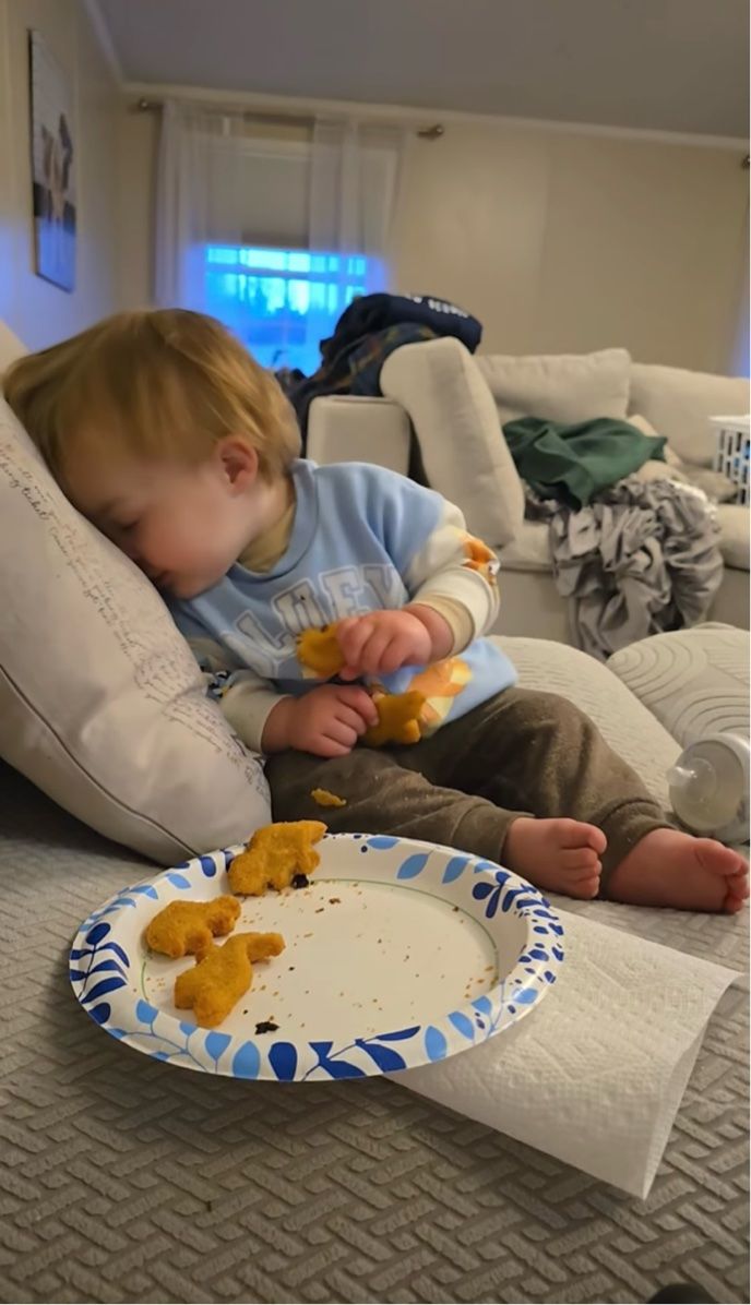 男の子は起き上がり、おめめを半分閉じた状態ながらも恐竜ナゲットをモグモグ。 まだ大好きな恐竜ナゲットを食べたいようです。