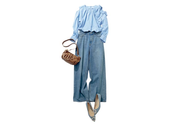 リボンショルダーブラウス¥18,700、ワイドデニムパンツ¥17,600/ともにマイストラーダ チェーン付きバッグ¥7,590/カシュカシュ(アンビリオン) ビジューバレエシューズ¥3,490/神戸レタス