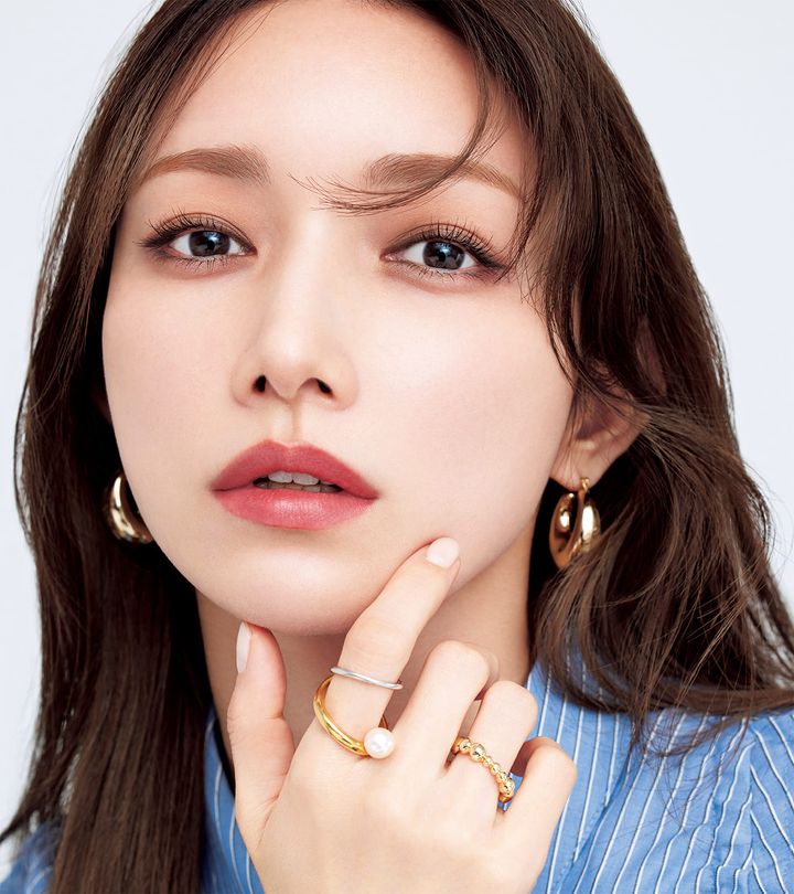 シャツ ¥5,940(ザ ショップ ティーケー/ワールド プレスインフォメーション)ピアス ¥3,800<KRONOS>リング[薬指]¥23,100<mysha>リング[人差し指]¥29,700<Pearl for Life>(すべてロードス)