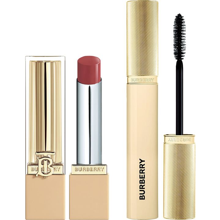 左:ツヤと血色を上品に演出し、英国のエッセンスを取り入れたローズペタル。バーバリー ブリット シャイン 606 ¥5,720、右:漆黒で印象的なボリュームのあるまつ毛に。バーバリー ビヨンド ボリューム マスカラ ¥5,500(ともにバーバリー ビューティ)