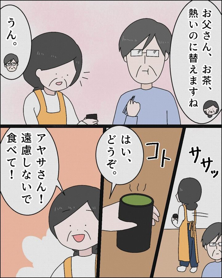 3. 義父は座っているだけで上げ膳据え膳、熱いお茶。夫が期待しても私は無理。家で一番偉いオレ|ママ広場マンガ