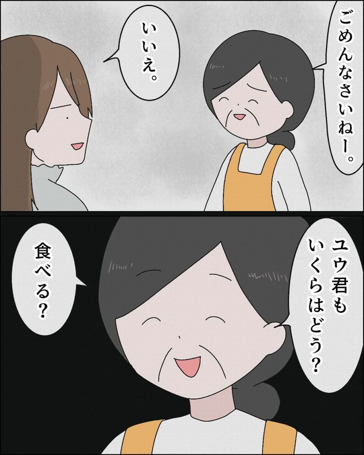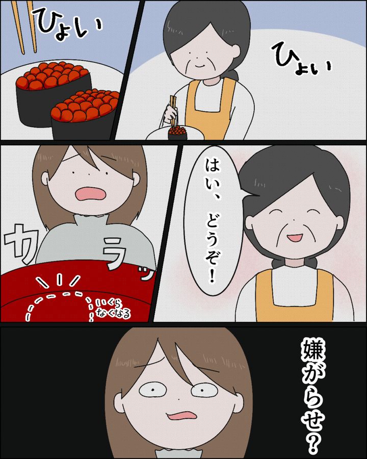 義実家で出前寿司を取ってもらったものの、義父とユキヒロが食べたいものを好きなだけ言って義母に取ってもらうのがこの家の食事スタイル。ようやく私の順番が来て、残っていたいくらに手を伸ばしかけた瞬間、義母が制止するかのように義父にいくらをすすめ、更に「ユウ君もいくらはどう?食べる?」と。え?私今、いくらを取ろうとしてたの見てたよね?