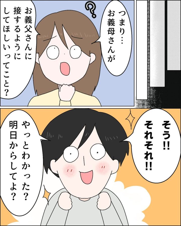 義実家での出前寿司を思い出し、「つまり、お義母さんがお義父さんに接するようにしてほしいってこと?」と聞くと、パアッと明るい顔をしたユキヒロが「そう!!それそれ!!やっとわかった?明日からしてよ?」と念を押してきました。